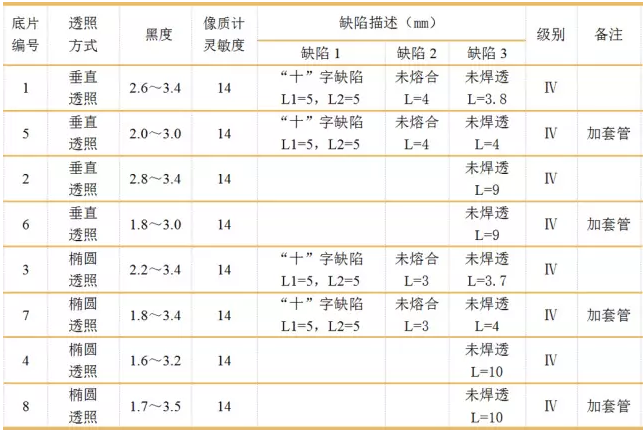 同時,試驗解決了因透照厚度差大,導致缺陷靈敏度無法滿足規范要求的問題,加套管缺陷基本能清晰顯示,但缺陷有略微放大現象,但不影響最終的檢測質量評價。