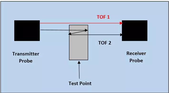 測量的基本原理如下圖所示。發射和接收換能器之間的超聲波飛行時間(TOF)通過水路測量得出(在裝置中不加鑄件樣品)(圖中的TOF1)。接下來測量出代表鑄件兩側水路的飛行時間以及聲波在鑄件中完成一次往返所需的時間(圖中的TOF2)。隨后根據測量部件的厚度和兩個測量的TOF值即可計算出聲波的傳播速度。