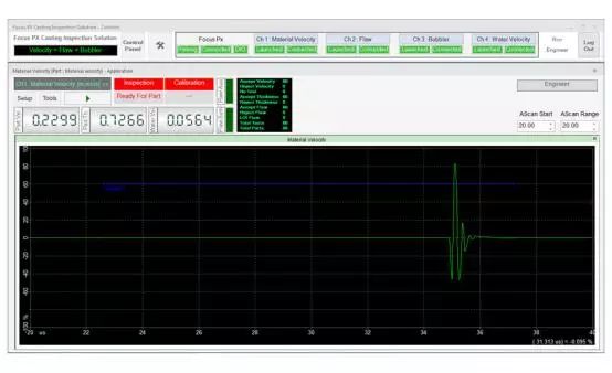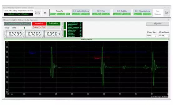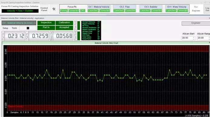 在檢測期間,可以通過用戶界面上的LED屏幕觀察檢測順序。接受/拒絕排序決定也會顯示在LED屏幕上,并在數字輸入/輸出總線上發出信號,顯示每個檢測鑄件的速度數值、厚度和水中聲速測量結果等信息。每個鑄件的測量值都會繪制在趨勢圖上。接受的和拒絕的零件數以及檢測的總零件數由用戶界面上的零件計數器進行計數和顯示。檢測結果最終可導出為CSV文件,用于離線文檔存儲和分析。